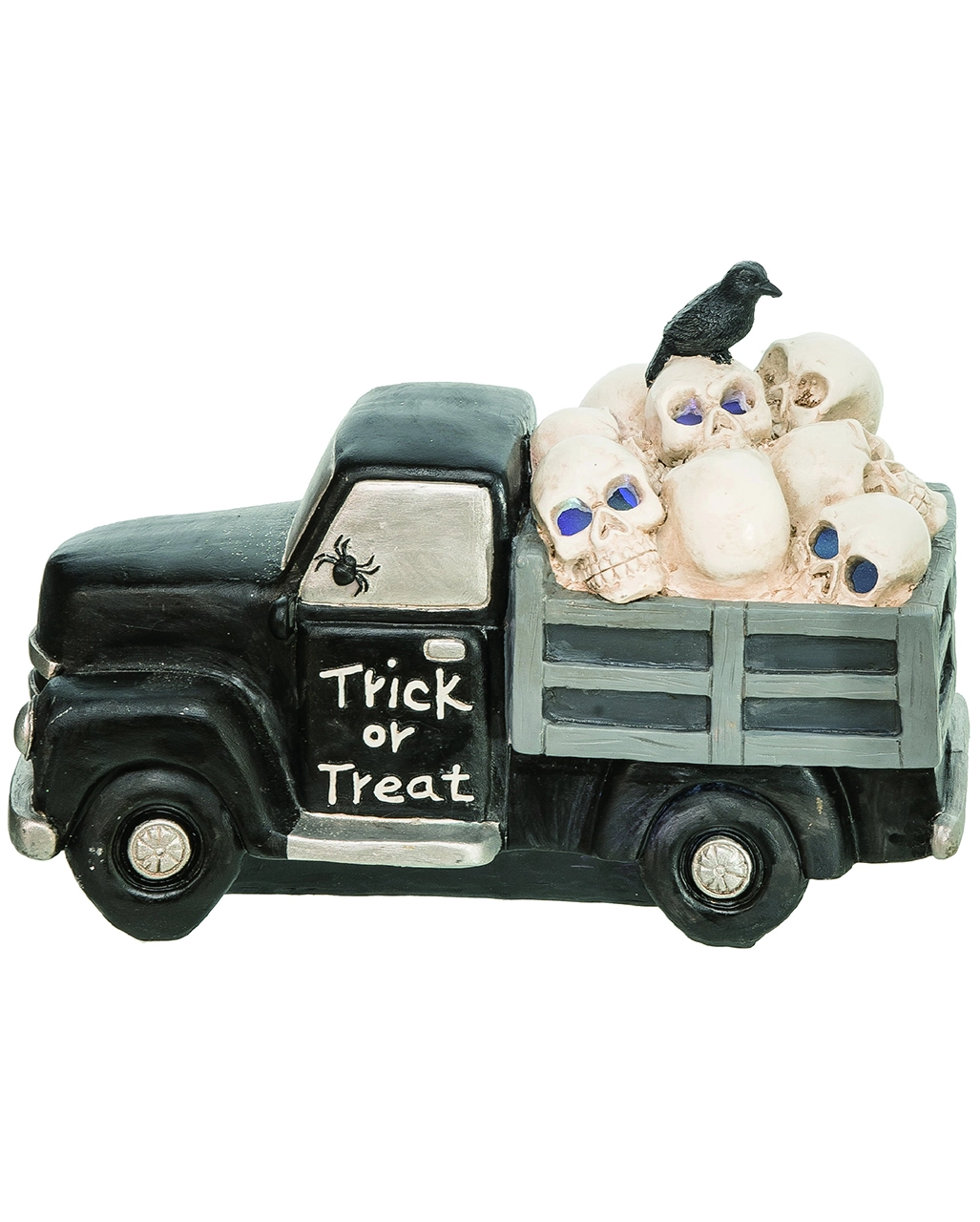 Der Halloween Lieferwagen Trick or Treat mit LED besteht aus Kunststein und Kunststoff. Die Totenschädel verfügen über mystisch leuchtende Augen. Auf den Schädeln ruht ein schwarzer Rabe. Auf der Tür des Lieferwagens ist der Schriftzug „Trick or Treat“. zu lesen. Lass dir auch den Halloween Wohnwagen Deko nicht entgehen.