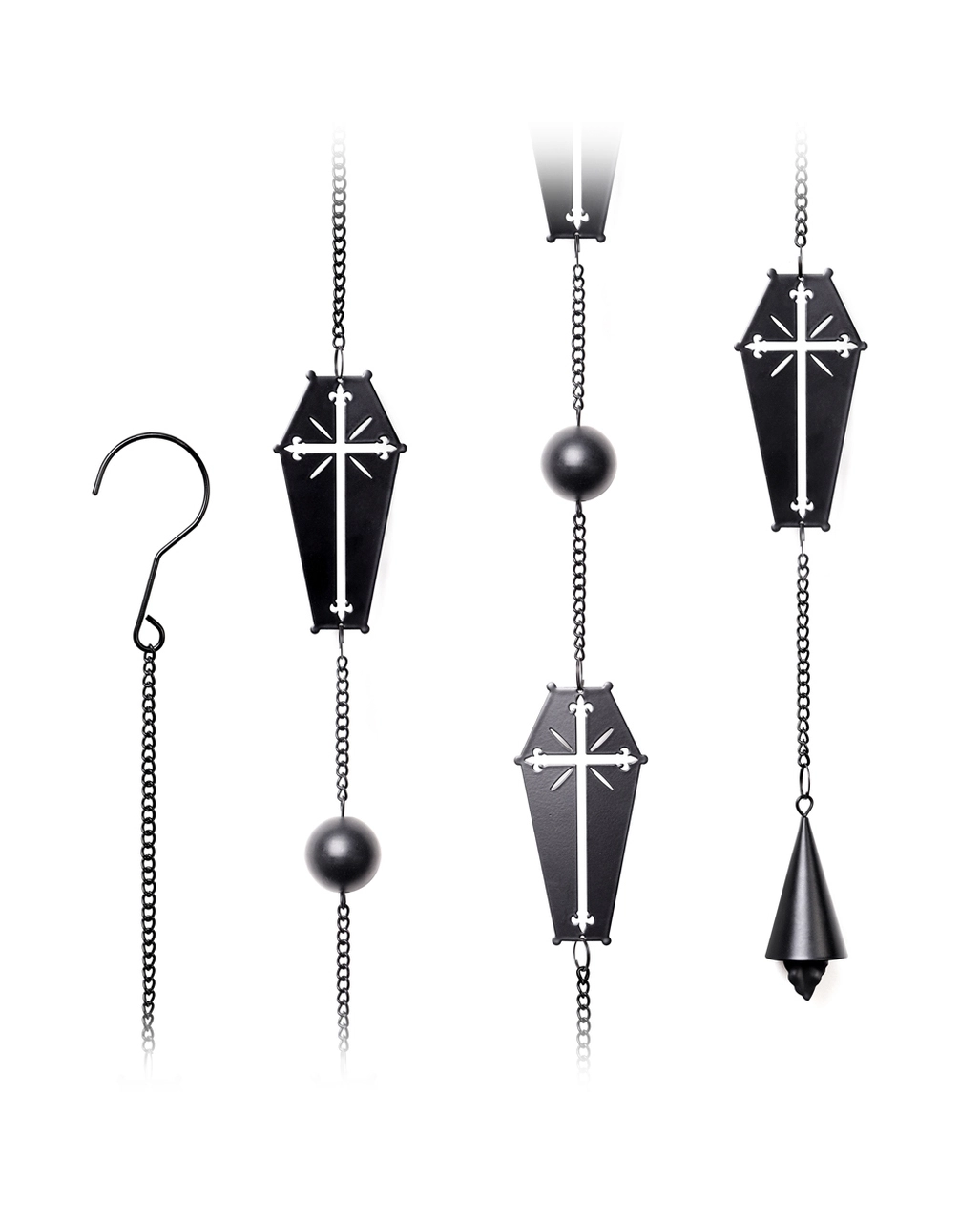 Unsere Sarg mit Kreuz Metall Windspiel Hängedeko lässt sich dank des Hakens ganz einfach an der Decke oder Wand befestigen. Die matt-schwarze Legierung der Särge sorgt für einen stylischen Look. Auch als Gothic Geschenkidee kann unser Sarg Mobile überzeugen. Entdecke auch das Cosmic Mobile KILLSTAR.