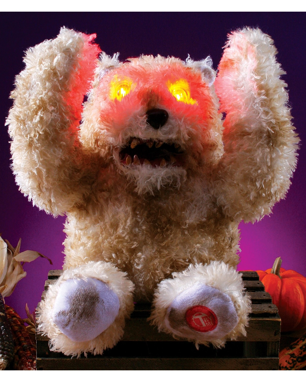 Eine süße Kinderstimme aus dem Zombie Grusel Bär fragt dich „Want to play a game with me? – not play?“ & dann verwandelt sich der knuffige Plüschbär in ein Monster! Er öffnet seine Arme – dann leuchtet ein gruseliges Teddy Gesicht mit roten Augen und einem riesigen Maul mit großen Zähnen und der scary Horror Teddy fängt monströs an zu lachen. Wenn das nicht die ideale Halloween Deko für deine Gruselparty ist!